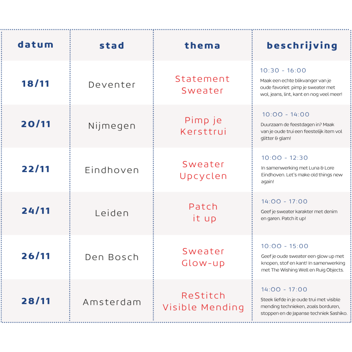 Geef je vergeten sweater een opknapbeurt in onze Sweater Upcycle Studio! In november kun je in verschillende ReShare Stores terecht voor een creatieve workshop. Breng je oude, vergeten of saaie sweater mee en geef ’m een frisse upgrade met hulp van lokale makers en duurzame materialen.